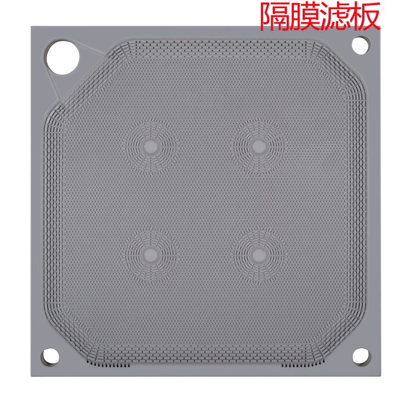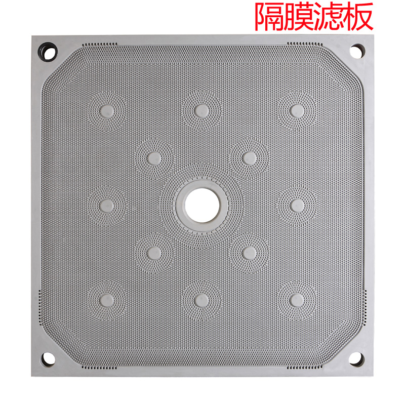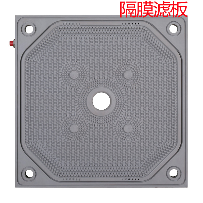 产品简介:隔膜滤板两侧均为可横向移动的过滤膜片,向膜片内通入压榨介质,可使膜片向过滤腔室内鼓出,从而使滤室中的滤饼在整个过滤面上受压,即在过滤结束后,对滤饼进行再次压榨。